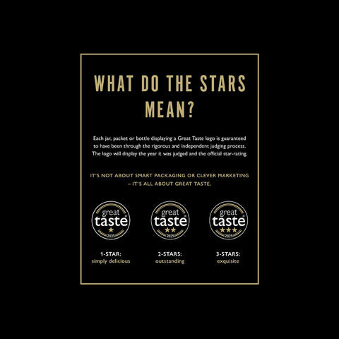 Great Taste je největší a nejdůvěryhodnější mezinárodní ocenění za chuť — produkty se hodnotí naslepo a získávají 1–3 hvězdy jako garanci kvality.